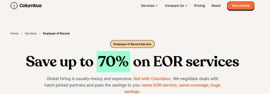 Hire with Columbus launched in 2025, making it the newest provider on this list by a significant margin. Its pricing from USD $179 per employee per month is the most aggressive on the market, and 24 to 48-hour onboarding with no setup fees makes it accessible for founders who need to move quickly on a budget. The risks attached to that pricing are proportionate. A partner-network model rather than owned entities reduces transparency over how local compliance obligations are actually managed, and a business founded in 2025 has had no opportunity to demonstrate how it handles the complex compliance scenarios that inevitably arise when employing people across diverse international jurisdictions. For early-stage founders testing a single market on a tight budget, the cost advantage may be acceptable. For businesses making compliance-sensitive hires where getting it wrong carries financial or regulatory consequences, the absence of an established track record is a material concern.