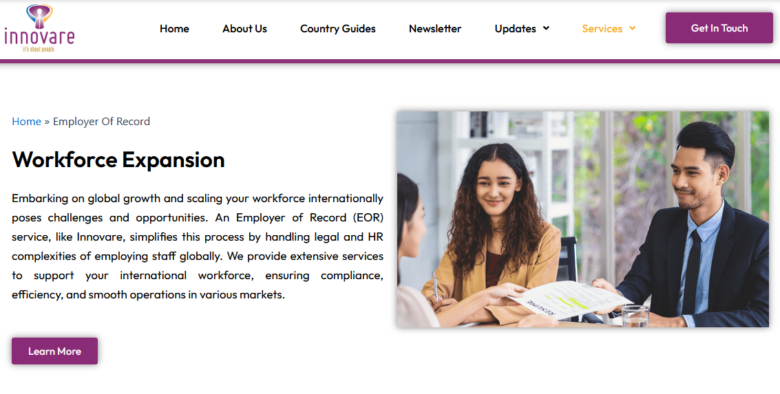 Innovare Group has years of APAC compliance experience and depth across Southeast Asia, South Korea, India, and the broader region. Its people-first service model and dedicated account management make it a considered option for project-based or fixed-duration engagements, and the absence of a minimum headcount requirement is a practical advantage for businesses testing a new market with a small initial hire. The constraints are equally clear. Coverage is limited to approximately 25 countries, making it unsuitable for businesses with multi-region expansion ambitions beyond APAC. The technology platform is noticeably less advanced than modern SaaS-first providers, and pricing requires a direct conversation with no public benchmarks to inform initial budgeting.